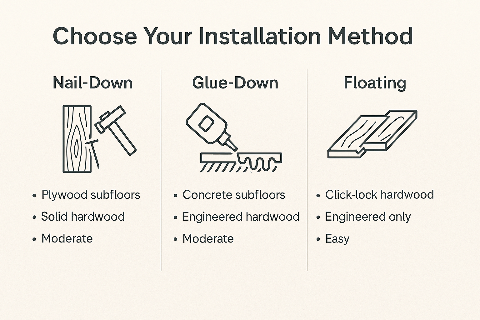 Tool / MaterialSolid Hardwood (Nail-Down)Engineered Hardwood (Glue-Down)Engineered Hardwood (Floating/Click-Lock)Purpose